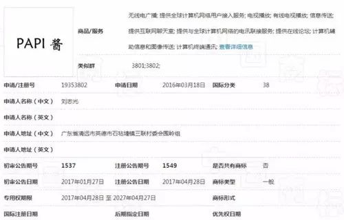 中國商標(biāo)權(quán)的獲得必須履行商標(biāo)注冊程序,而且實(shí)行申請?jiān)谙仍瓌t。比起大佬們周密的商標(biāo)注冊計劃,被稱為“2016第一網(wǎng)紅”的“Papi醬”(真名姜逸磊)在這方面則顯得不夠敏感。