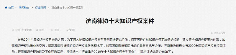 【聚焦】山東千慧律師事務(wù)所兩例代理案件入選“濟南律協(xié)2019年十大知識產(chǎn)權(quán)典型案例”