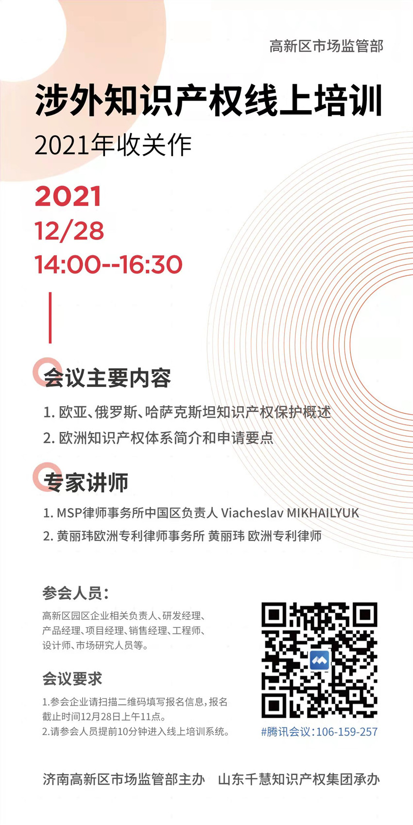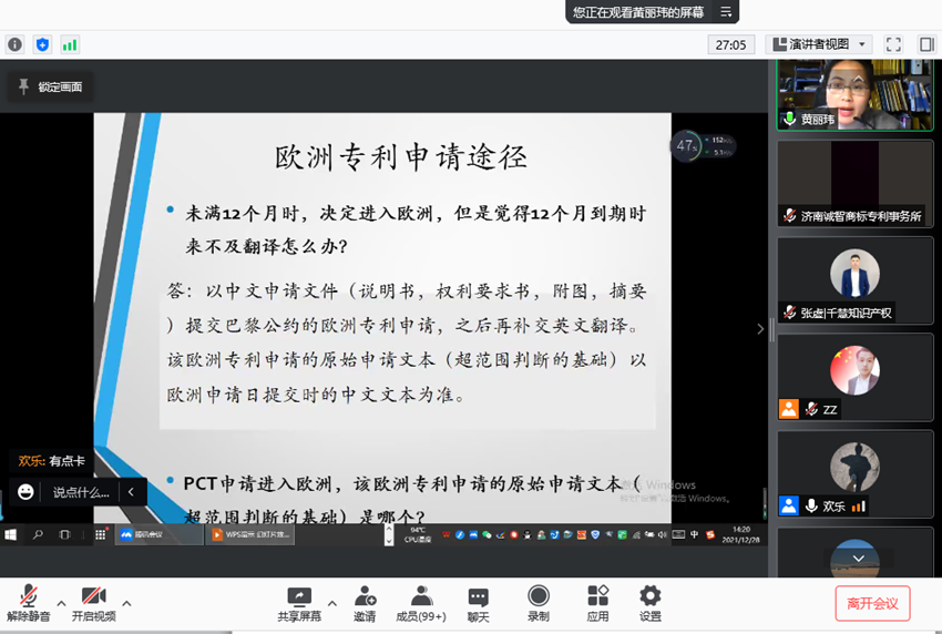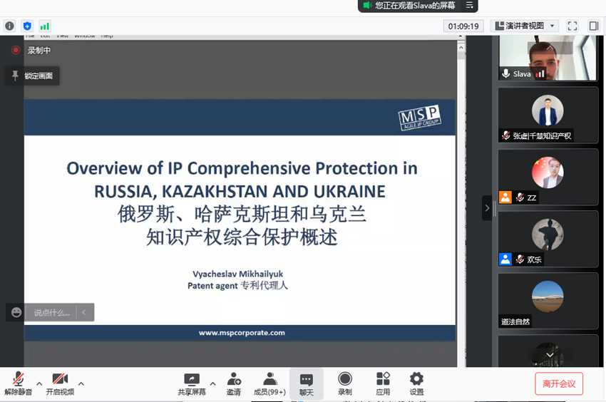 此次培訓(xùn)由千慧知識(shí)產(chǎn)權(quán)集團(tuán)涉外主管晏歡樂主持,邀請(qǐng)到MSP律師事務(wù)所中國(guó)區(qū)負(fù)責(zé)人Viacheslav Mikhailyuk、歐洲專利律師事務(wù)所黃麗瑋律師進(jìn)行線上分享,分享內(nèi)容包括歐亞、俄羅斯、哈薩克斯坦知識(shí)產(chǎn)權(quán)保護(hù)概述,歐洲知識(shí)產(chǎn)權(quán)體系簡(jiǎn)介和申請(qǐng)要點(diǎn)等實(shí)用專業(yè)知識(shí),分享嘉賓以內(nèi)、外知識(shí)產(chǎn)權(quán)體系的異同為抓手,結(jié)合實(shí)際案例,對(duì)企業(yè)涉外知識(shí)產(chǎn)權(quán)的診斷、規(guī)劃和實(shí)施提出了針對(duì)性的建議,高新區(qū)企業(yè)負(fù)責(zé)人、產(chǎn)品經(jīng)理、工程師、知識(shí)產(chǎn)權(quán)服務(wù)機(jī)構(gòu)等150余人在線參加,并對(duì)培訓(xùn)過程中思考的問題進(jìn)行了提問,現(xiàn)場(chǎng)培訓(xùn)氣氛熱烈。