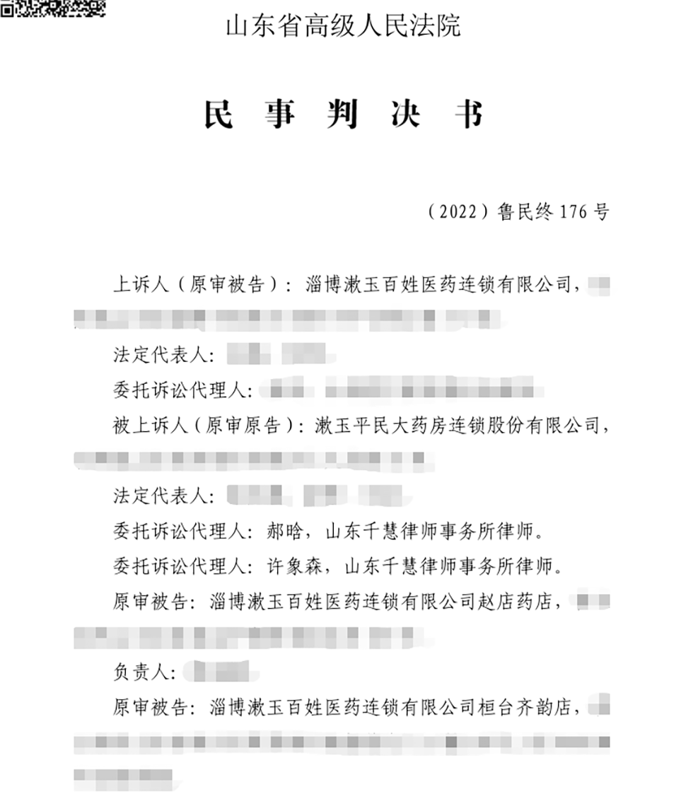 山東千慧律師事務(wù)所代理的“漱玉平民大藥房連鎖股份有限公司訴淄博漱玉百姓醫(yī)藥連鎖有限公司侵害商標(biāo)權(quán)及不正當(dāng)競(jìng)爭(zhēng)糾紛”一案,成功入選。