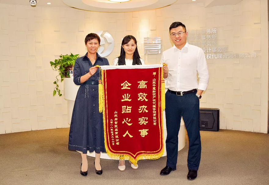 2017年,山東啟智飲品有限公司岳總因商標異議問題又找到了千慧,由于案情復雜,隨即開始了近一年的服務,并于近日打贏了這場商標異議及商標無效宣告案件。在這個過程中,千慧團隊利他、誠信、專業(yè)、專注的服務理念和真誠、細致、認真、負責的敬業(yè)態(tài)度贏得了岳總的贊譽,并獲贈一副題為“高效辦實事,企業(yè)貼心人”的錦旗。