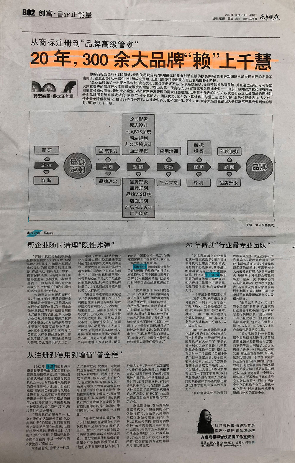 “企業(yè)品牌保護(hù)一定要產(chǎn)品未動(dòng)、商標(biāo)先行,僅僅注冊還不夠,必須系統(tǒng)保護(hù),提前預(yù)知并防范風(fēng)險(xiǎn),并且通過商標(biāo)、專利等知識(shí)產(chǎn)權(quán)資產(chǎn)的深度開發(fā)實(shí)現(xiàn)最大限度的增值。”在山東第一代商標(biāo)人、我省首家著名商標(biāo)企業(yè)—山東千慧知識(shí)產(chǎn)權(quán)代理有限公司董事長李俠看來,無論大小企業(yè),對(duì)品牌保護(hù)及管理的需求日益增加,以千慧為代表的支持產(chǎn)權(quán)代理行業(yè)正從最簡單的商標(biāo)注冊向品牌服務(wù)管家模式轉(zhuǎn)變,依靠20年積累的人才團(tuán)隊(duì)優(yōu)勢,迄今為止累計(jì)客戶總量已超過5萬家,業(yè)務(wù)代理量達(dá)30多萬件,使企業(yè)免除侵權(quán)訴訟,搶占競爭對(duì)手先機(jī),助推企業(yè)多元化和國際化。其中,300余家大品牌更是因?yàn)殚L期離不開其專業(yè)到位的服務(wù),而“賴”上了千慧。