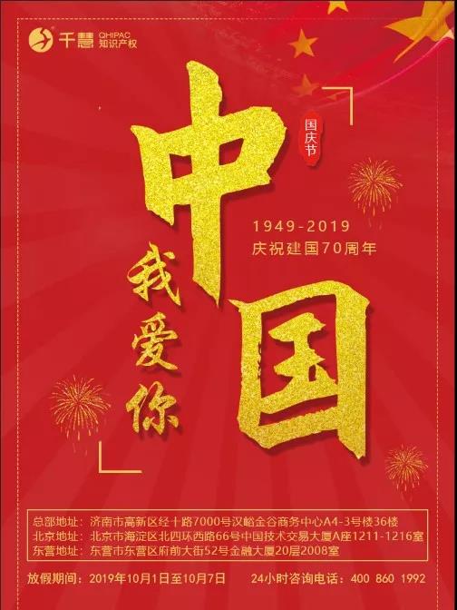 建國70周年之際干慧知識產(chǎn)祝愿祖國繁榮昌盛、國泰民安。