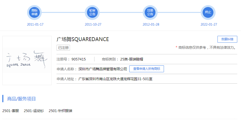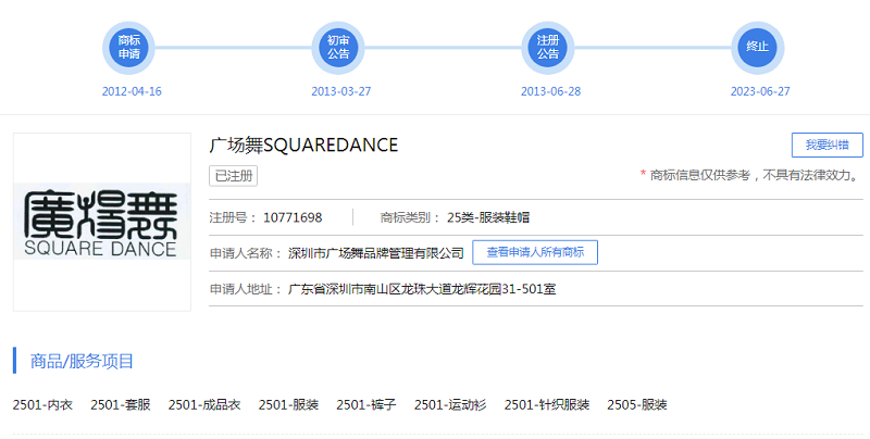 事情是這樣的,深圳某服裝行分別于2011年和2012年申請(qǐng)了第9057415號(hào)“廣場舞”商標(biāo)和第10771698號(hào)“廣場舞”商標(biāo),核定使用于熱門類別第25類-服裝鞋帽等商品上。