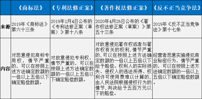 事實上,在2013年修改通過的《商標(biāo)法》第六十三條首次明確規(guī)定了商標(biāo)侵權(quán)行為中懲罰性賠償;2019年1月4日,全國人大常委會公布的《專利法修正案(草案)》中,也包含了懲罰性賠償?shù)臈l文規(guī)定;2019年《反不正當(dāng)競爭法》第十七條規(guī)定了懲罰性賠償;2020年4月26日全國人大常委會公布的《著作權(quán)法修正案(草案)征求意見》第五十三條規(guī)定了懲罰性賠償。