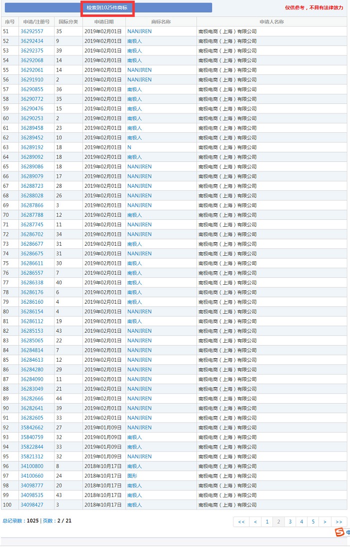 企查查數(shù)據(jù)顯示,南極電商成立于2010年,所屬租賃和商務(wù)服務(wù)業(yè)。商標(biāo)局網(wǎng)站數(shù)據(jù)顯示,南極電商目前共申請(qǐng)商標(biāo)1025件,包括“南極人”、“NANJIREN”、“泰無(wú)敵 THE GREAT TEDDY”、“白金舒福絨”等商標(biāo)。