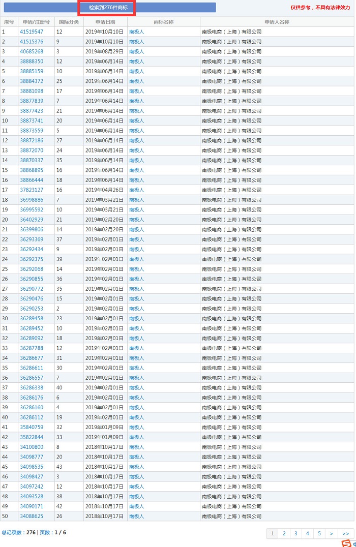 而南極電商共申請(qǐng)了包含“南極人”字樣的申請(qǐng)商標(biāo)276件。