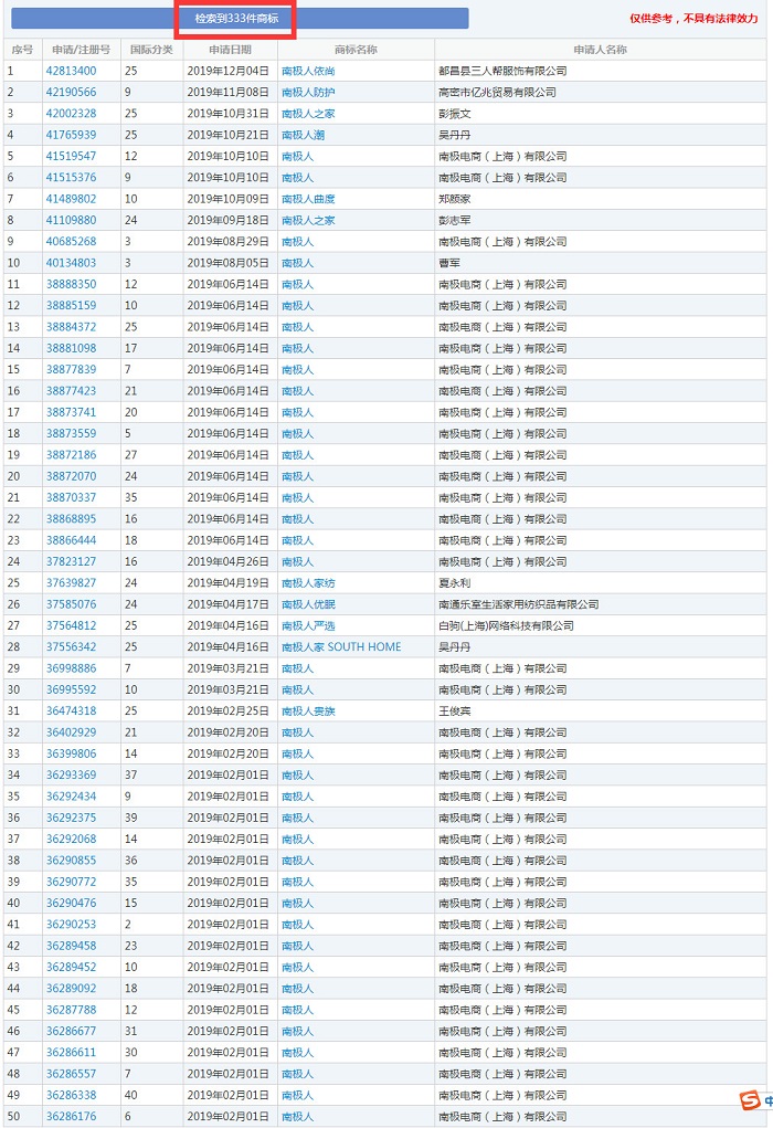 商標(biāo)局網(wǎng)站查詢得知,目前含有“南極人”字樣的申請(qǐng)商標(biāo)共有333件;