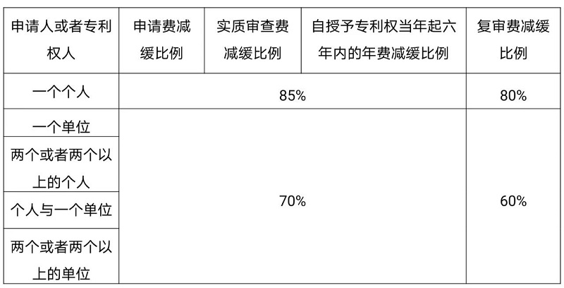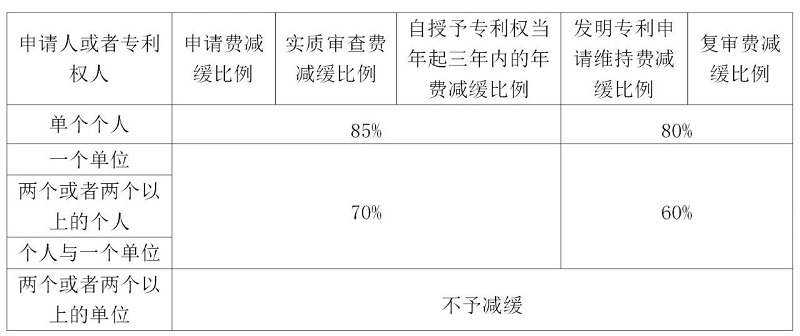 表1 局令第39號(hào)中規(guī)定的專(zhuān)利費(fèi)用減緩的類(lèi)別和減緩比例表
