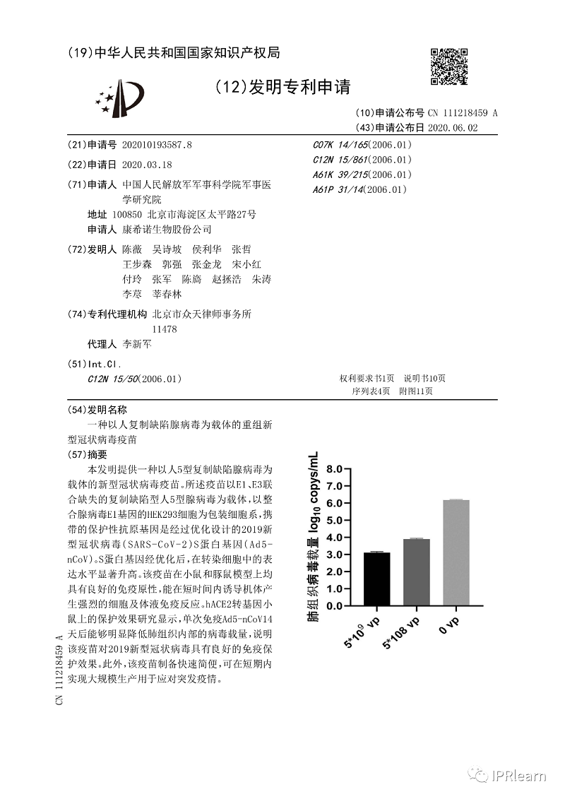 近日網(wǎng)上關(guān)于國產(chǎn)新冠疫苗專利獲批的信息,國家知識產(chǎn)權(quán)局18日對外公布,確認(rèn)有關(guān)“軍科院軍事醫(yī)學(xué)研究院陳薇院士團(tuán)隊及康希諾生物聯(lián)合申報的新冠疫苗專利申請已被授予專利權(quán)”的情況屬實。該發(fā)明專利申請享有優(yōu)先審查政策。