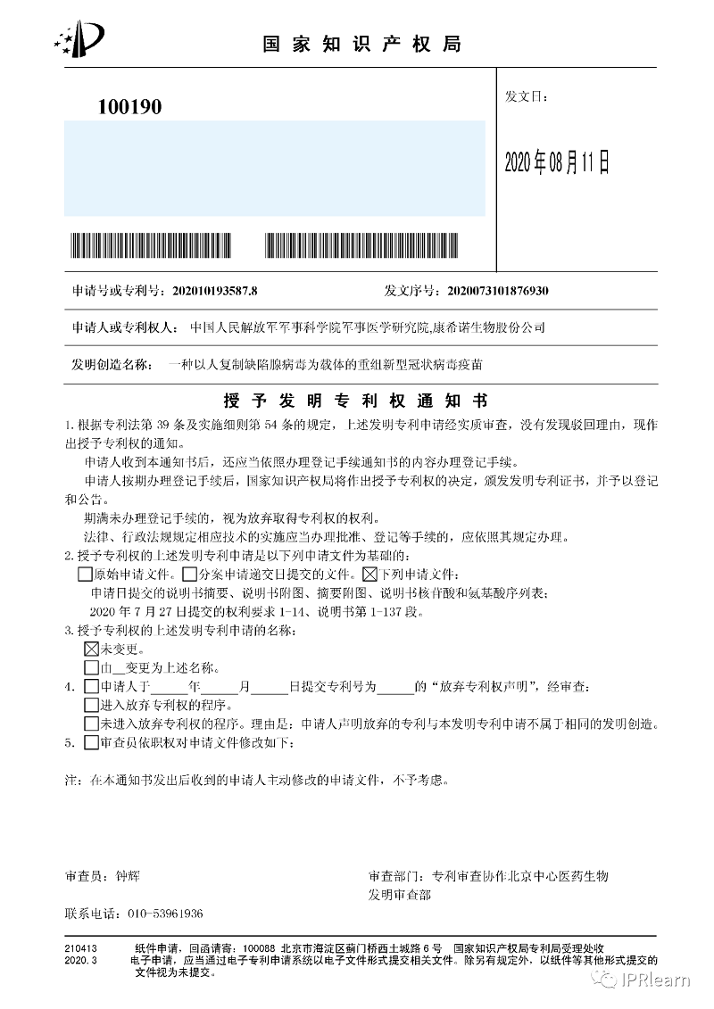 據(jù)國家知識產(chǎn)權(quán)局介紹,經(jīng)核,該疫苗專利申請發(fā)明名稱為“一種以人復(fù)制缺陷腺病毒為載體的重組新型冠狀病毒疫苗”,該專利申請?zhí)枮?02010193587.8,申請人為中國人民解放軍軍事科學(xué)院軍事醫(yī)學(xué)研究院和康希諾生物股份公司,發(fā)明人為陳薇等,申請日為2020年3月18日,經(jīng)提交優(yōu)先審查請求后,國家知識產(chǎn)權(quán)局于2020年8月11日發(fā)出專利授權(quán)通知書,待申請人依法辦理專利權(quán)登記手續(xù)后,該局將公告授權(quán)該專利。