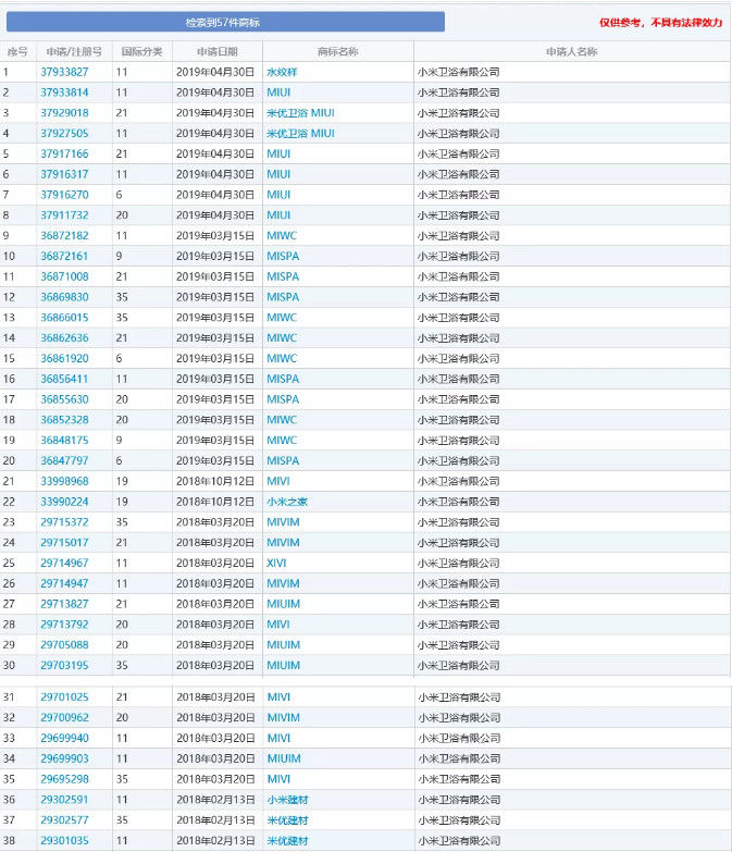 據(jù)了解,小米衛(wèi)浴公司于2014年4月3日注冊成立,經(jīng)營范圍涉及生產(chǎn)、加工、銷售衛(wèi)浴潔具配套產(chǎn)品、五金制品及配件、家具、陶瓷制品、日用品等。小米衛(wèi)浴公司原法定代表人王某某于2012年3月5日提交了第16493289號“MIUI”商標的注冊申請,2016年6月7日被核準注冊使用在滅火器、計步器等第9類商品上;2013年11月25日,王某某提交第13595158號、第13595159號“MIUI”商標注冊申請,2015年2月28日分別被核準注冊使用在家庭用陶瓷制品、垃圾桶等第21類商品與家具、竹木工藝品等第20類商品;2014年4月14日,王某某提交了第14368244號“MIUI”商標的注冊申請,2015年5月28日被核準注冊使用在金屬水管閥、普通金屬藝術(shù)品等第6類商品。經(jīng)核準,王某某將其提交注冊申請的上述后3件“MIUI”商標轉(zhuǎn)讓予小米衛(wèi)浴公司。