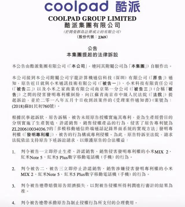 ◆ 2018年5月10日,在小米提交赴港IPO申請后,酷派集團(tuán)再一次發(fā)布公告表示,小米集團(tuán)的多款手機(jī)侵犯了酷派的專利權(quán),要求小米集團(tuán)停止銷售小米MIX 2、紅米Note 5、紅米5 Plus、紅米Note 4X、小米6、小米Max 2、小米Note 3以及小米5X,并賠償經(jīng)濟(jì)損失。