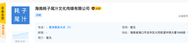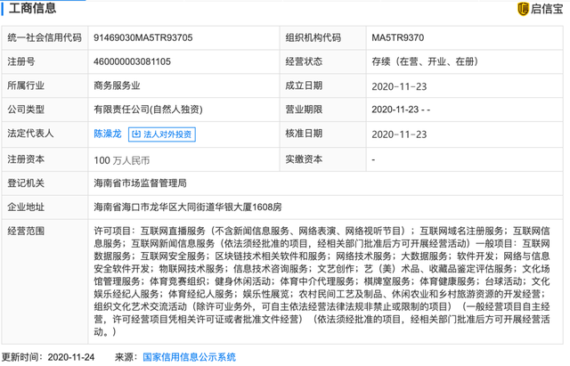 據(jù)啟信寶數(shù)據(jù)顯示,11月23日,海南耗子尾汁文化傳媒有限公司成立,注冊資本100萬,法定代表人、全資股東為陳澡龍,經(jīng)營范圍包括互聯(lián)網(wǎng)直播服務(wù);互聯(lián)網(wǎng)域名注冊服務(wù);互聯(lián)網(wǎng)信息服務(wù);互聯(lián)網(wǎng)新聞信息服務(wù)等。