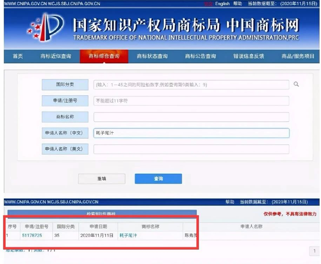 值得一提的是,在該公司成立之前,“耗子尾汁”于11月11日被搶注商標(biāo)了。國際分類為35類廣告銷售,申請人為陳秀茂,商標(biāo)類型為普通商標(biāo)。商標(biāo)狀態(tài)為 “注冊申請中”。