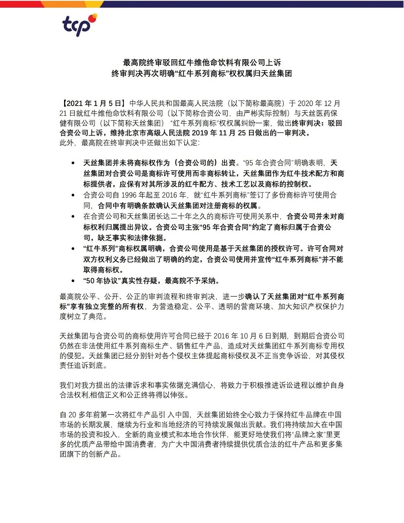 【2021年1月5日】中華人民共和國最高人民法院(以下簡稱最高院)于 2020 年 12 月21 日就紅牛維他命飲料有限公司(以下簡稱合資公司,由嚴(yán)彬?qū)嶋H控制)與天絲醫(yī)藥保健有限公司(以下簡稱天絲集團(tuán)) “紅牛系列商標(biāo)”權(quán)權(quán)屬糾紛一案,做出終審判決:駁回合資公司上訴,維持北京市高級(jí)人民法院 2019 年11月25日做出的一審判決。