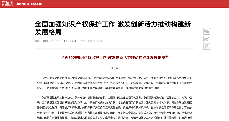 2月1日,《求是》雜志發(fā)表了重要文章《全面加強知識產權保護工作 激發(fā)創(chuàng)新活力推動構建新發(fā)展格局》。文章強調,創(chuàng)新是引領發(fā)展的第一動力,保護知識產權就是保護創(chuàng)新。全面建設社會主義現(xiàn)代化國家必須更好推進知識產權保護工作。