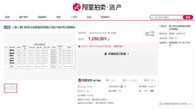 2月28日,備受關(guān)注的廈門好兆頭廚柜股份有限公司名下7件注冊(cè)商標(biāo)順利完成拍賣,經(jīng)過131次出價(jià),最終拍出了1250001元。