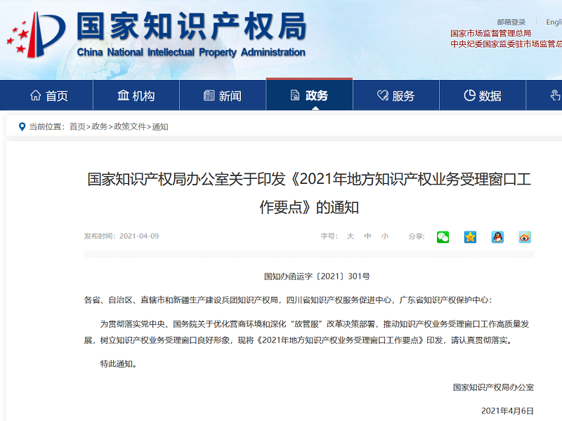 國家知識產(chǎn)權(quán)局辦公室關(guān)于印發(fā)《2021年地方知識產(chǎn)權(quán)業(yè)務(wù)受理窗口工作要點》的通知