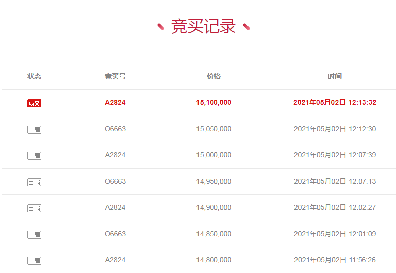 記者注意到,在5月1日拍賣剛開始的時候,“A2824”曾出價110萬元。即便這一報價很快被其他競買者的報價壓下,但“A2824”沒有急于出手,而是等到次日。