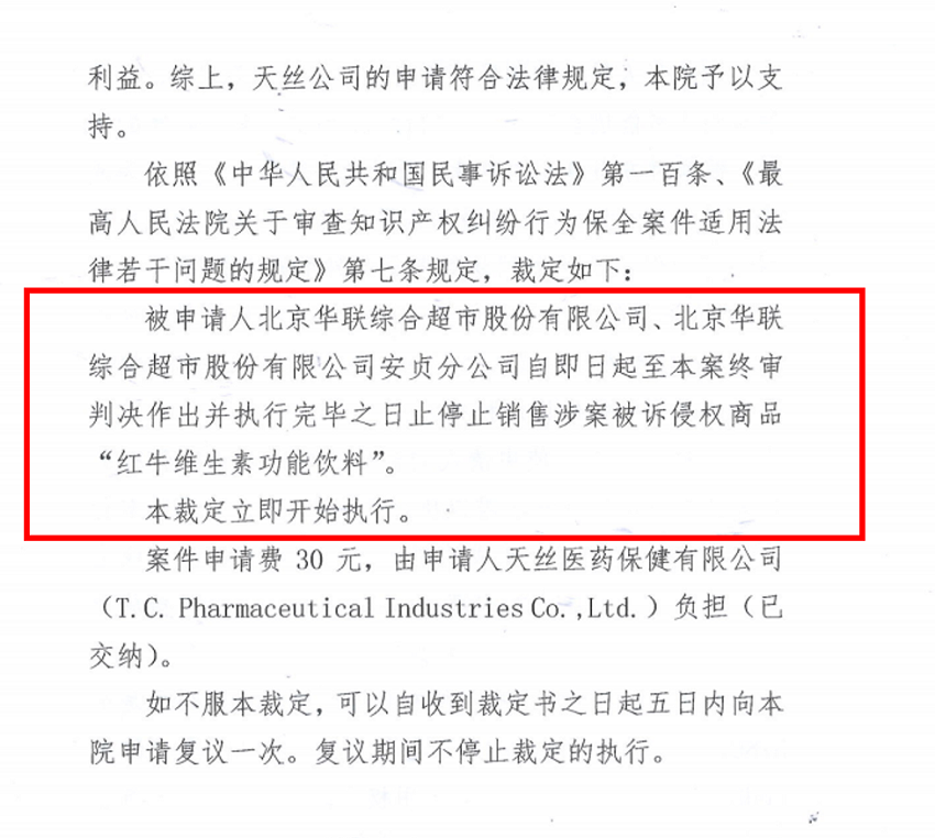 2021年5月12日,北京市朝陽區(qū)人民法院依法作出行為保全民事裁定書(案號(hào):(2021)京0105民初47483號(hào)),裁定“北京華聯(lián)綜合超市股份有限公司”(以下簡稱“華聯(lián)超市”)即日起停止銷售紅牛維他命飲料有限公司出品的 “紅牛維生素功能飲料”。