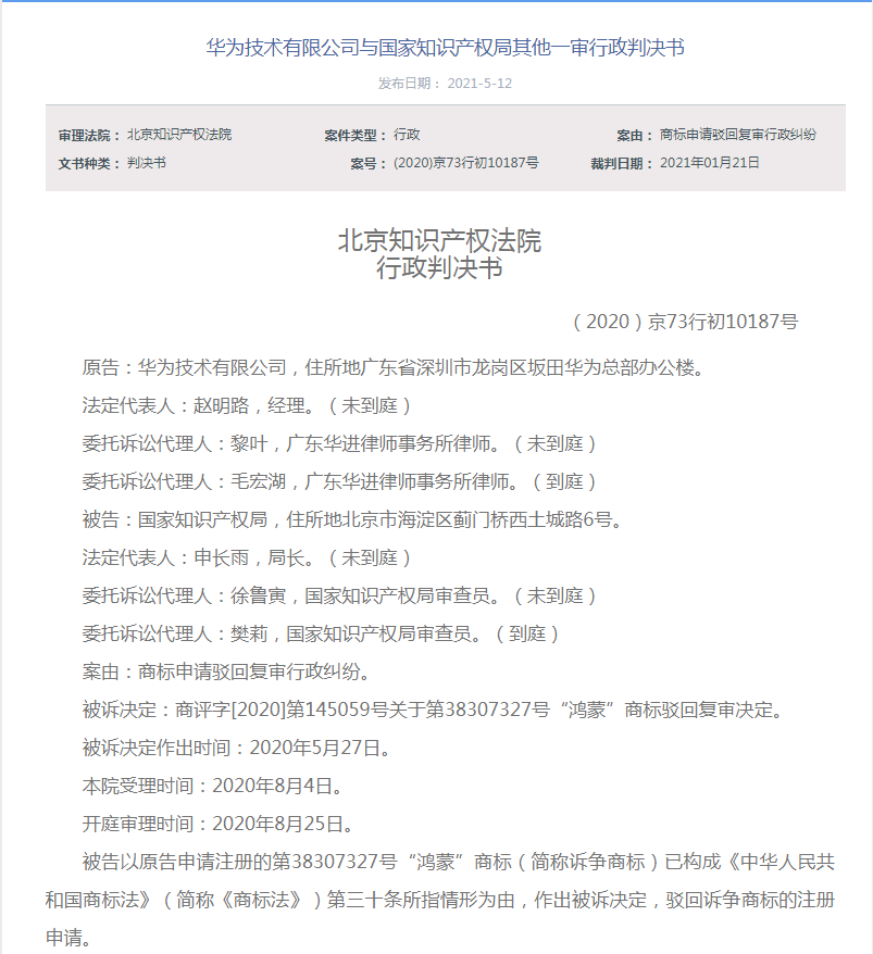 5月12日,北京法院審判信息網(wǎng)公開了華為技術(shù)有限公司與國家知識產(chǎn)權(quán)局的相關(guān)判決書。判決書顯示,華為對于“鴻蒙”商標的相關(guān)訴訟請求被法院駁回。