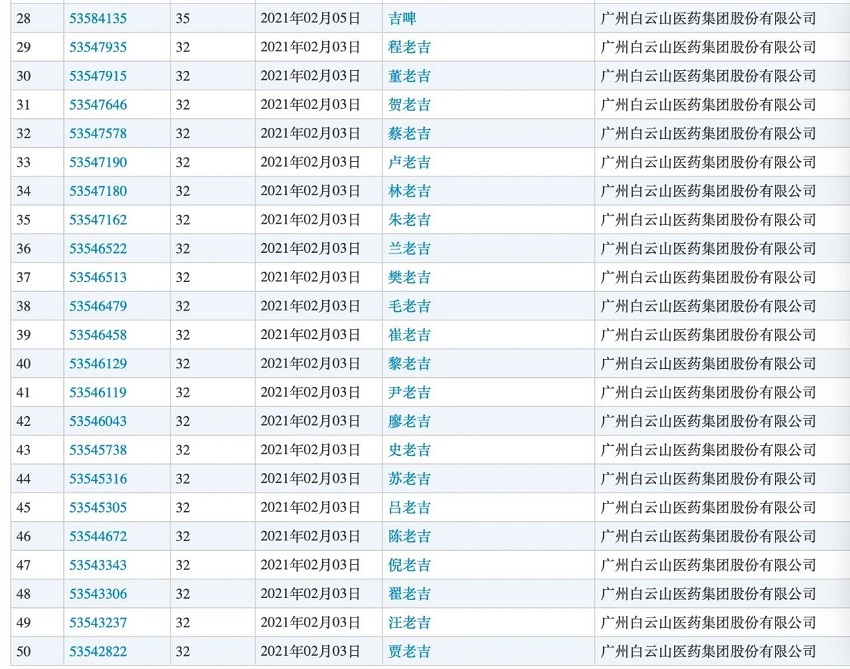 “趙錢(qián)孫李、周吳鄭王。馮陳褚衛(wèi),蔣沈韓楊?!苯铡栋偌倚铡分械男帐希赏趵霞诠疽孕帐?“老吉”,進(jìn)行了百家姓系列“X老吉”商標(biāo)申請(qǐng)?!笆捓霞?、程老吉、趙老吉、孫老吉……”中國(guó)商標(biāo)網(wǎng)公開(kāi)信息顯示,這些商標(biāo)均是在2021年2月3日一天之內(nèi)申請(qǐng)的,共計(jì)100個(gè)。且這些商標(biāo)申請(qǐng)的均非30類(lèi)涼茶商品,而是在32類(lèi)啤酒、茶味非酒精飲料、果汁等商品中。