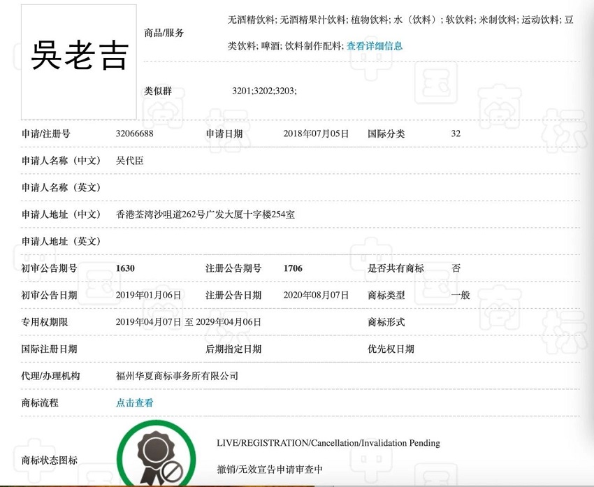 中國(guó)商標(biāo)網(wǎng)公示信息顯示,早在2018年7月,一個(gè)名叫“吳代臣”的人已在32類(lèi)商品中申請(qǐng)了“吳老吉”商標(biāo)。該商標(biāo)包含了啤酒、茶味非酒精飲料;、無(wú)酒精飲料、果汁、植物飲料、水(飲料)、蒸餾水(飲料)、能量飲料、純凈水(飲料)等,與目前王老吉申請(qǐng)的“姓氏+老吉”飲料的商品范圍重合?!皡抢霞鄙虡?biāo)于2020年8月7日注冊(cè)公告,專(zhuān)用權(quán)期限為2019年4月7日至2029年4月6日。