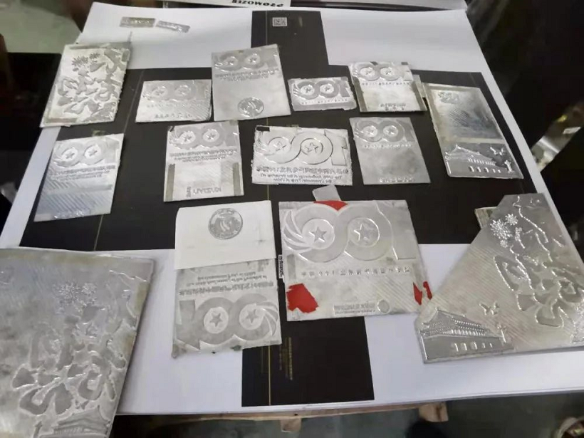 根據(jù)舉報線索,執(zhí)法人員迅速出擊到某餐具公司進(jìn)行現(xiàn)場檢查,發(fā)現(xiàn)該公司展品展示區(qū)擺放的限量版公筷公勺禮盒的包裝袋、包裝盒、禮品卡乃至產(chǎn)品本身均印有類似“中國共產(chǎn)黨成立100周年慶祝活動”及“建黨百年特殊標(biāo)志”的標(biāo)識。經(jīng)了解,上述產(chǎn)品系該公司委托某印刷廠印制,根據(jù)該公司提供的線索,執(zhí)法人員立刻到該印刷廠開展調(diào)查,查獲標(biāo)注有用于印制上述產(chǎn)品的特殊標(biāo)識的模具17個。