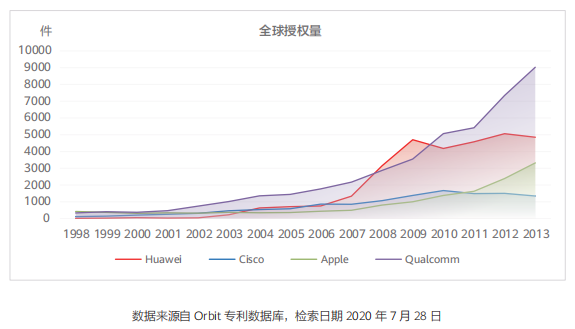 據(jù)《華為創(chuàng)新和知識(shí)產(chǎn)權(quán)白皮書》顯示,從 2004 年開始,華為公司全球?qū)@跈?quán)量達(dá)到同行業(yè)領(lǐng)先的美國(guó)公司同等規(guī)模。下圖為華為公司及部分同行業(yè)公司在 1998-2013 年獲得全球?qū)@跈?quán)數(shù)量統(tǒng)計(jì)圖。