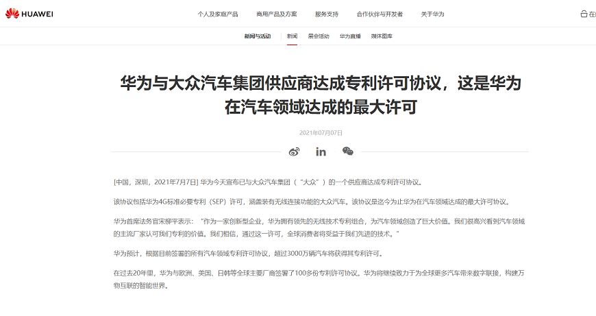 7月7日,華為官網(wǎng)發(fā)布《華為與大眾汽車集團(tuán)供應(yīng)商達(dá)成專利許可協(xié)議,這是華為在汽車領(lǐng)域達(dá)成的最大許可》。
