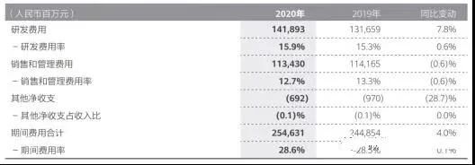 據(jù)華為2020年年度報(bào)告顯示,華為在2020年的研發(fā)投入為141,893百萬(wàn),研發(fā)費(fèi)用率為15.9%,比2019年增加了0.6%。