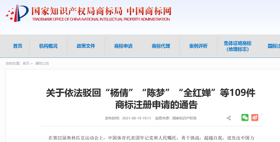 關(guān)于依法駁回“楊倩”“陳夢”“全紅嬋”等109件商標(biāo)注冊申請的通告