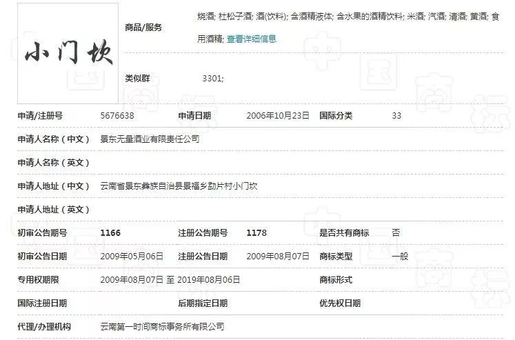 經(jīng)查詢,早在2006年10月23日,就有公司在第33類“酒、飲料”類別申請“小門坎”商標(biāo),并于2009年8月7日注冊成功。
