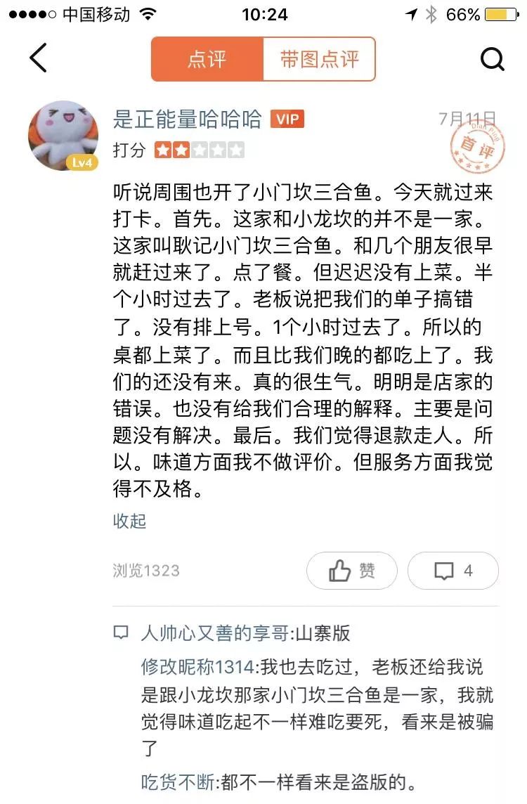 “修改昵稱1314”的網(wǎng)友也在大眾點評上表示,他去吃過這家店,該店老板還給他說跟小龍坎的“小門坎三合魚”是一家,但是感覺味道不對,看來是遭“騙”了。