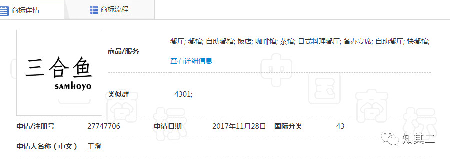 而在2017年11月28日,就有人在第43類餐飲類別申請注冊“三合魚”商標(biāo),目前狀態(tài)是等待駁回通知發(fā)文。顯然“三合魚”是火鍋魚的一種,是通用名稱,不能作為商標(biāo)使用。