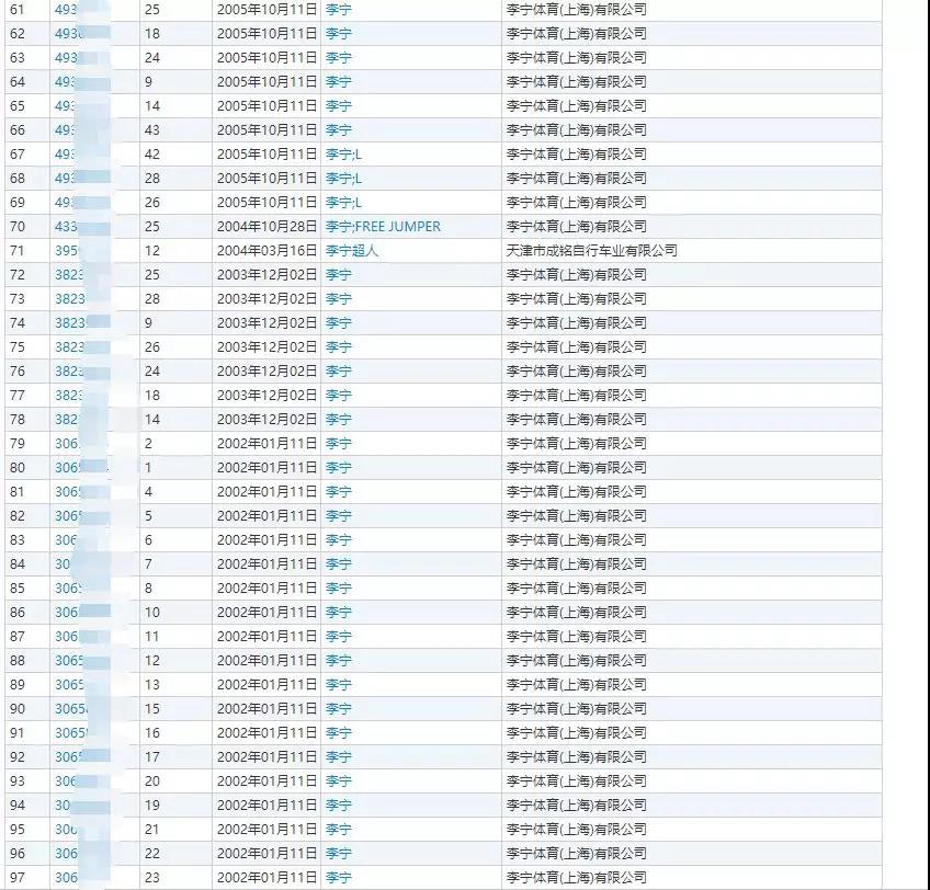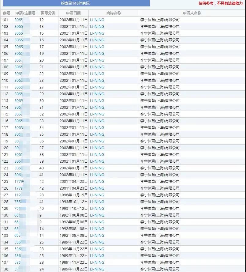 李寧(Li-Ning)部分商標(biāo)注冊情況截圖