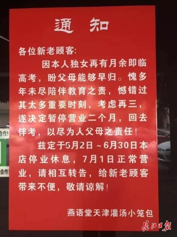 今年5月份,江蘇人劉先生將其在武漢的“燕語堂”湯包店關門,貼了一張歇業(yè)通知稱,獨生女兒面臨高考,決定暫停營業(yè)二個月,回去陪考。湯包店隨著這張告示走紅網絡,數千萬網友圍觀、評論、點贊,表示被這份歇業(yè)通知背后的父女情感動,不少食客慕名而來。