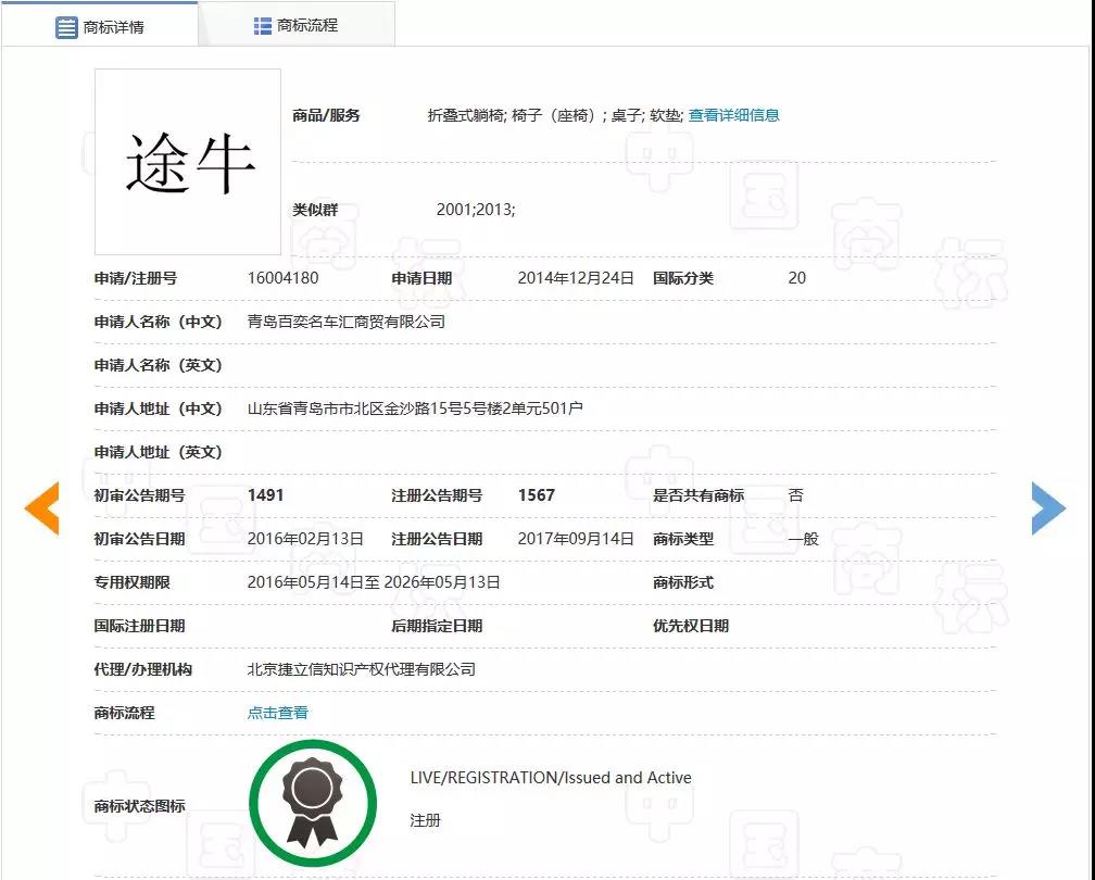 第16004180號“途牛”商標(biāo)(以下稱爭議商標(biāo))由青島百奕名車匯商貿(mào)有限公司(即本案被申請人)于2014年12月24日提出注冊申請,2017年7月4日經(jīng)異議程序決定被準(zhǔn)予注冊,核定使用在第20類“折疊式躺椅、墊褥(亞麻制品除外)”等商品上。2017年12月11日,該商標(biāo)被南京途??萍加邢薰荆幢景干暾埲耍┨岢鰺o效宣告請求。申請人稱:“途?!鄙虡?biāo)系申請人獨創(chuàng),具有很強的顯著性,經(jīng)過大量廣泛的使用宣傳已在旅游行業(yè)具有極高的知名度和影響力。爭議商標(biāo)是對申請人第6631862號“途牛”商標(biāo)(以下稱引證商標(biāo))的復(fù)制和抄襲,爭議商標(biāo)的注冊將淡化申請人“途牛”商標(biāo)的顯著性,造成消費者誤認。請求依據(jù)《商標(biāo)法》第十三條等規(guī)定,宣告爭議商標(biāo)無效。對此,被申請人的主要答辯意見為:“途?!睘楸簧暾埲霜殑?chuàng)詞匯,爭議商標(biāo)經(jīng)被申請人長期使用,其顯著特征更加突出,并在消費者中具有相當(dāng)高的知名度。申請人申請馳名商標(biāo)保護的主張不符合法律規(guī)定。請求維持爭議商標(biāo)的注冊。