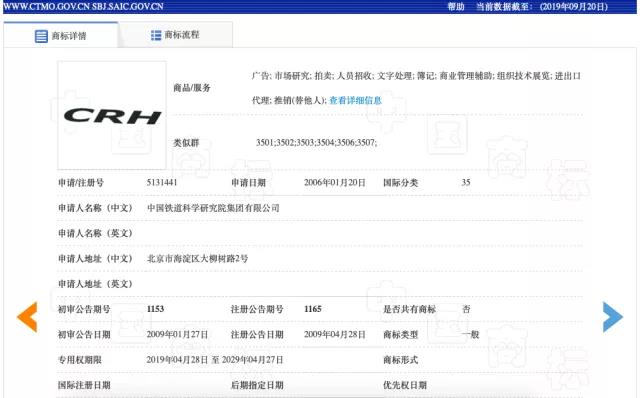 而CRH正是我國高鐵的英文縮寫,在每輛高鐵的白色車身上,我們都能看到明顯的“CRH”標(biāo)志。鐵科院作為我國鐵路唯一的綜合性研究機構(gòu),承擔(dān)著我國高鐵的建設(shè)、運營、維護工作,高鐵“CRH”的商標(biāo)權(quán)也由鐵科院享有。鐵科院擁有的涉案的第35類“CRH”商標(biāo)注冊于2006年,在2009年4月取得商標(biāo)專用權(quán)。記者查詢發(fā)現(xiàn),鐵科院共在43個門類上注冊了“CRH”商標(biāo),本案爭議商標(biāo)則是其中之一。