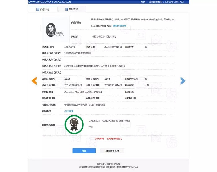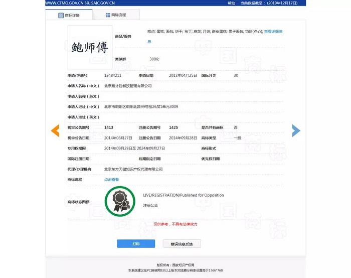 其中北京鮑才勝公司,也就是火遍大街小巷的網(wǎng)紅糕點(diǎn)“鮑師傅”的注冊(cè)公司,其擁有第12484211號(hào)“鮑師傅”商標(biāo)的專用權(quán),核定使用在第30類:糕點(diǎn)、蛋糕等商品類別。而北京佳文佳樂(lè)公司、北京西貢雨小吃店則稱其使用的“鮑師傅”文字是對(duì)第17899096號(hào)注冊(cè)商標(biāo)(以下稱“引證商標(biāo)”)文字部分的合理使用,據(jù)中國(guó)商標(biāo)網(wǎng)查詢可知,該商標(biāo)的申請(qǐng)人為北京易尚餐飲管理有限公司,核定使用在第43類:流動(dòng)飲食供應(yīng)、餐館、餐廳等商品類別。