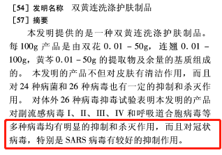 為了收集雙黃連治療冠狀病毒方面研究的信息,我們開展了專利檢索,并發(fā)現(xiàn):早在非典時期,哈藥集團就開展了雙黃連在治療冠狀病毒的應用。隨后,哈藥集團還申請了雙黃連洗滌護膚制品相關的專利,其本質,也是雙黃連在抑制冠狀病毒方面的用途。在隨后的2011年,哈藥集團便申請了雙黃連含漱水專利,其同樣也是應用了雙黃連對冠狀病毒的抑制作用:這從一個側面證明了雙黃連對冠狀病毒是有一定的抑制作用的,這個事實本身看起來沒什么問題,只是武漢病毒研究所發(fā)布該“發(fā)現(xiàn)”的方式似乎有些欠妥。假設把“雙黃連對冠狀病毒是有一定的抑制作用”作為“發(fā)現(xiàn)”,如果武漢病毒研究所把“中成藥雙黃連口服液可抑制新型冠狀病毒”作為“驗證”,可能也不會招致如此大的爭議。
