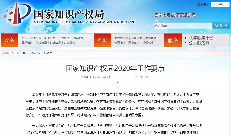 2020年工作的總體要求是:堅持以習(xí)近平新時代中國特色社會主義思想為指導(dǎo),深入學(xué)習(xí)貫徹黨的十九大、十九屆二中、三中、四中全會精神和黨中央、國務(wù)院決策部署,落實市場監(jiān)管總局黨組要求,牢牢把握黨對知識產(chǎn)權(quán)事業(yè)的全面領(lǐng)導(dǎo),推進全面從嚴治黨向縱深發(fā)展,全面提高機關(guān)黨建質(zhì)量,強化事業(yè)發(fā)展頂層設(shè)計,深化各領(lǐng)域改革創(chuàng)新,加強干部人才隊伍建設(shè),提升知識產(chǎn)權(quán)治理能力和治理水平,推動知識產(chǎn)權(quán)事業(yè)繼續(xù)穩(wěn)中求進、高質(zhì)量發(fā)展。