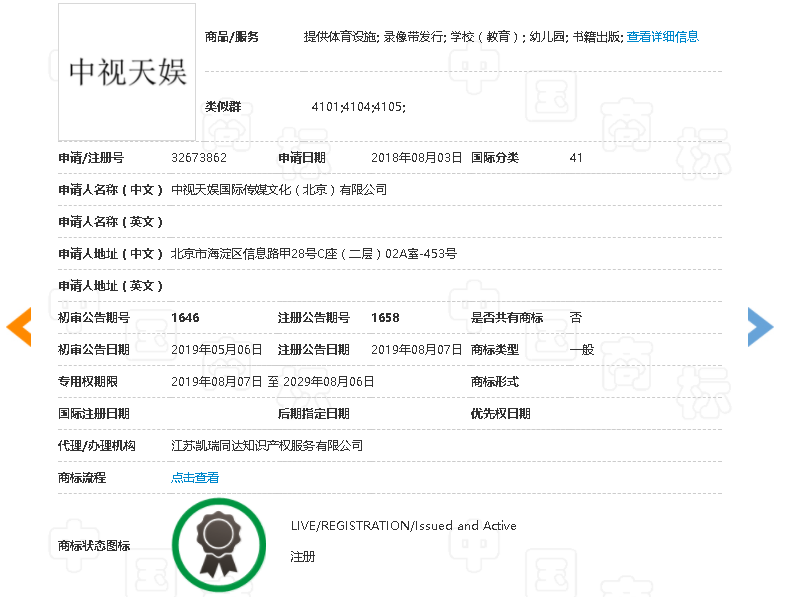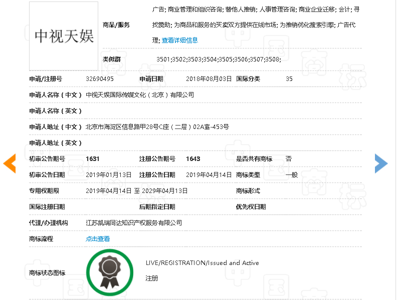 中視天娛公司于2018年申請(qǐng)注冊(cè)第32690495號(hào)“中視天娛”商標(biāo),并于2019年4月14日注冊(cè)成功,核定使用在第35類:廣告;商業(yè)管理和組織咨詢等替他人推銷;人事管理咨詢;商業(yè)企業(yè)遷移等商品服務(wù)類別。中視天娛公司另提交第32673862號(hào)“中視天娛”商標(biāo)的注冊(cè)申請(qǐng)受理通知書,初審公告日期為2019年5月6日,核定使用的商品服務(wù)類別為第41類。