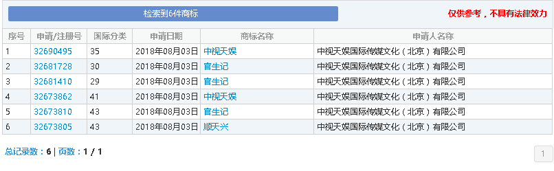 而中視天娛公司,截至目前則只申請(qǐng)了6件商標(biāo),其中除了本案提到的兩件“中視天娛”商標(biāo)外,還申請(qǐng)了“順天興”、“官生記”等商標(biāo),其核定使用的商品服務(wù)范圍則為養(yǎng)老院、茶館,食品等。