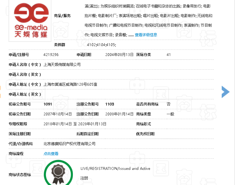 上海天娛公司于2004年申請(qǐng)了第4219296號(hào)商標(biāo)(以下稱“涉案商標(biāo)”),該商標(biāo)2008年1月14日注冊(cè)成功,經(jīng)續(xù)展注冊(cè)有效期至2028年1月13日,該商標(biāo)核定使用在第41類:“組織競賽(教育或娛樂);組織教育或娛樂競賽;安排選美競賽;組織選美;組織表演(演出)等商品服務(wù)類別。