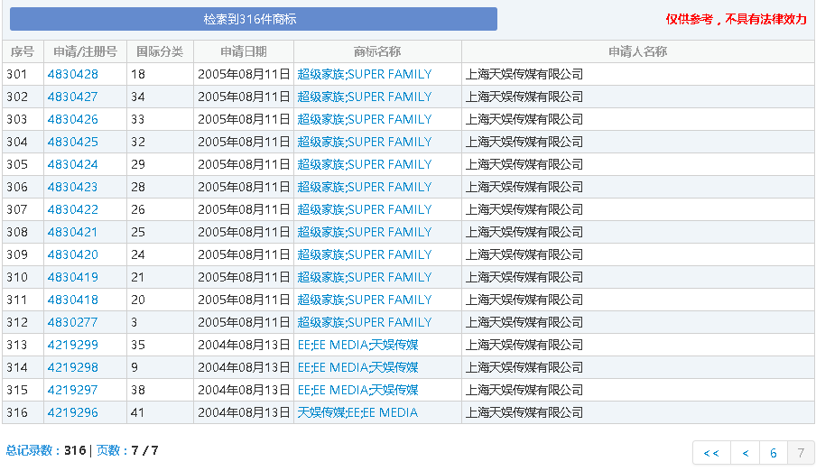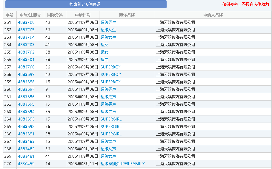 借此案,筆者查詢了中國商標(biāo)網(wǎng),對(duì)兩家公司的商標(biāo)情況一探究竟。經(jīng)商標(biāo)網(wǎng)查詢可知,上海天娛公司截止目前共申請(qǐng)了316件商標(biāo),其中申請(qǐng)最早的商標(biāo)也就是本案的涉案商標(biāo),含有“天娛傳媒”字樣,申請(qǐng)于2004年,除此之外,上海天娛公司還申請(qǐng)了諸如“超級(jí)女聲”、“超級(jí)男聲”商標(biāo),整體看來,在商標(biāo)方面還是做到了較好的布局。