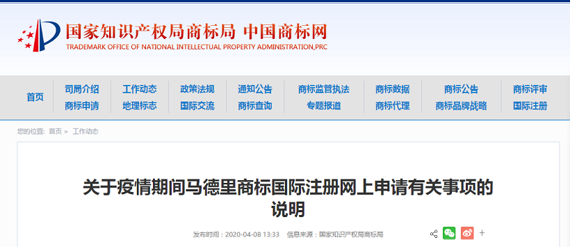 關(guān)于疫情期間馬德里商標(biāo)國際注冊網(wǎng)上申請有關(guān)事項的說明