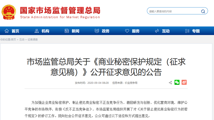 市場監(jiān)管總局關于《商業(yè)秘密保護規(guī)定(征求意見稿)》公開征求意見的公告