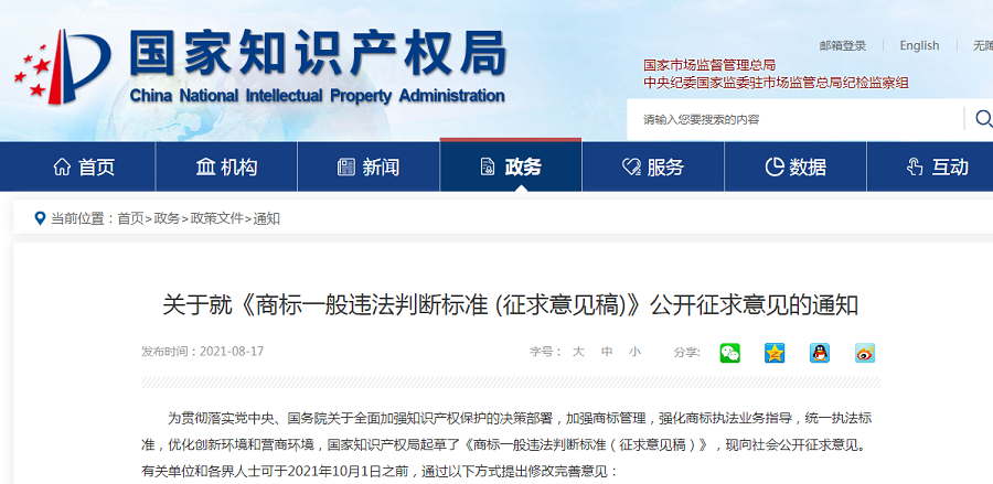 近日,國家知識產(chǎn)權(quán)局發(fā)布了關(guān)于就《商標(biāo)一般違法判斷標(biāo)準(zhǔn) (征求意見稿)》公開征求意見的通知,現(xiàn)向社會公開征求意見。有關(guān)單位和各界人士可于2021年10月1日之前,通過電子郵件、傳真或者信函的方式,提出修改完善意見。
